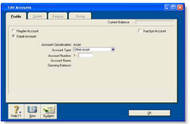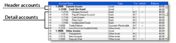 Header accounts - Your accounts list consists of detail accounts (the accounts to which you allocate transactions) and header accounts. Header accounts group related detail accounts to help you organise your accounts list.