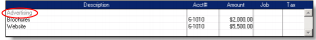 The scrolling list in the middle of the Purchases window is where you enter details of what you are buying. In this area, you enter item numbers, descriptions, account numbers (or account names, depending on your selection in the Preferences window) and other information about your transaction.