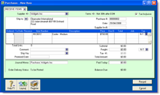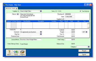 The procedure described in this section is for entering purchases in the Purchases window, which enables you to record full details about a transaction.