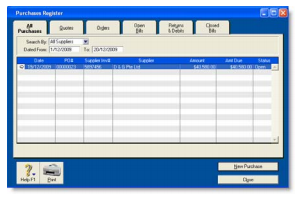 | Purchases Register | transactions relating to purchases (such as open and closed bills) quotes, orders, debits and returns. This method is most efficient if you know the transaction date or the supplier's name |