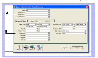 You can filter the amount of information that appears in your reports by choosing which categories or ranges of data should be included. For example, if you want to print a Sales Customer Summary report for a customer for the months May to July, you can use filters to select just that customer and just those months.