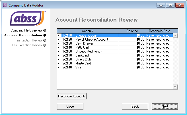 - When you have completed the required maintenance tasks, click Next. The Account Reconciliation Review window appears.