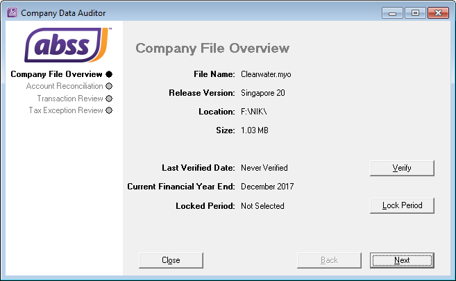 The Company Data Auditor is a series of windows that guides you through the process of checking and ensuring the accuracy of the records in your MYOB company file. You can use the auditor to: