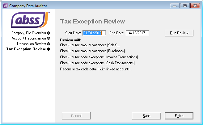- When you have finished viewing and, if necessary, printing the Transaction Review reports, click Next. The Tax Exception Review window appears.
